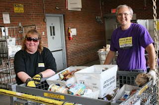 Once all the food is packed and sorted, the postal bins are loaded on FBR’s truck and brought to our warehouse. A long day ending for the letter carriers equals a busy evening fueling up for volunteers and staff at FBR. Over 100 volunteers arrive to tackle the overwhelming amount of food arriving at FBR! Our more muscular volunteers lift food bins off the truck and onto the scale – they’re heavy, averaging 1200 pounds!